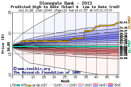 The high to date and low to date prices of the stock plotted against a random walk model for 2013 (what's this?).