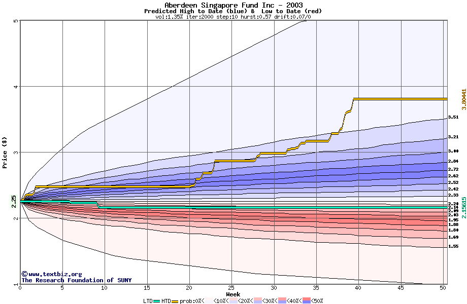 The high to date and low to date prices of the stock plotted against a random walk model for 2003 (what's this?).