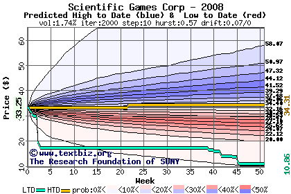 The high to date and low to date prices of the stock plotted against a random walk model for 2008 (what's this?).