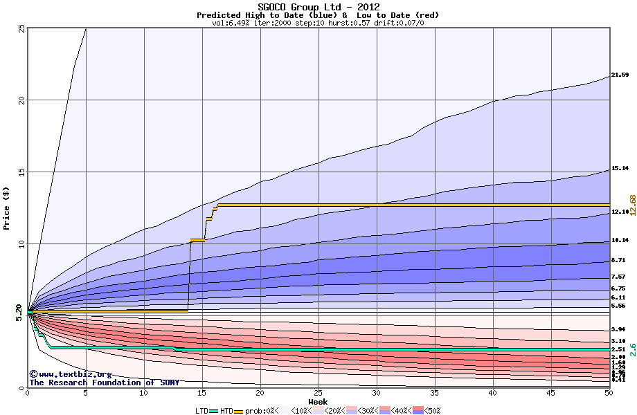 The high to date and low to date prices of the stock plotted against a random walk model for 2012 (what's this?).