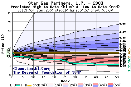 The high to date and low to date prices of the stock plotted against a random walk model for 2008 (what's this?).