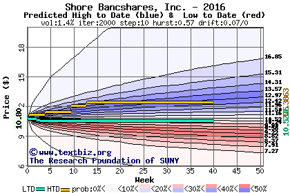 The high to date and low to date prices of the stock plotted against a random walk model for 2016 (what's this?).