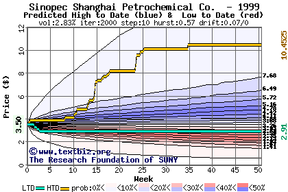 The high to date and low to date prices of the stock plotted against a random walk model for 1999 (what's this?).