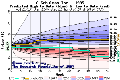 The high to date and low to date prices of the stock plotted against a random walk model for 1995 (what's this?).