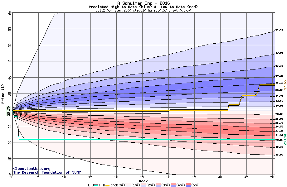 The high to date and low to date prices of the stock plotted against a random walk model for 2016 (what's this?).
