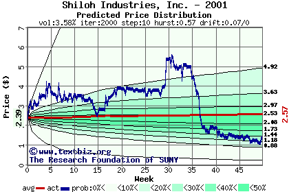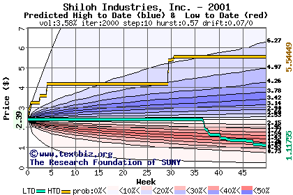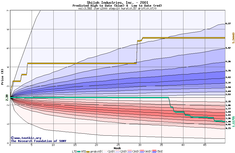 The high to date and low to date prices of the stock plotted against a random walk model for 2001 (what's this?).