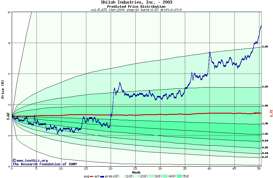The following graph plots the year-to-date performance of the stock for 2003 compared to the probability calculated by a random walk model.