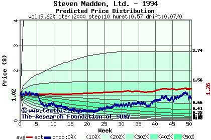 The high to date and low to date prices of the stock plotted against a random walk model for 1994 (what's this?).
