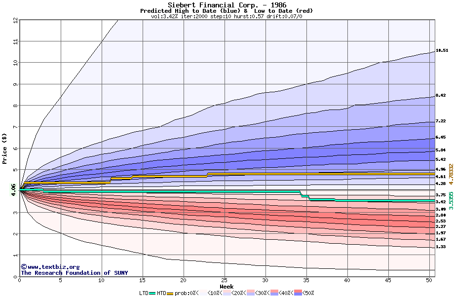 The high to date and low to date prices of the stock plotted against a random walk model for 1986 (what's this?).