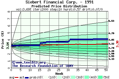 The high to date and low to date prices of the stock plotted against a random walk model for 1991 (what's this?).