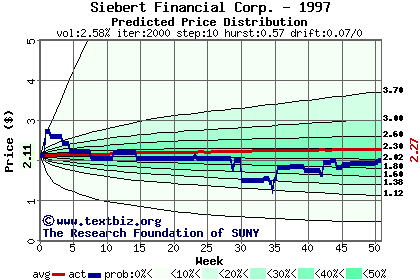 The high to date and low to date prices of the stock plotted against a random walk model for 1997 (what's this?).