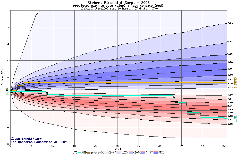 The high to date and low to date prices of the stock plotted against a random walk model for 2008 (what's this?).