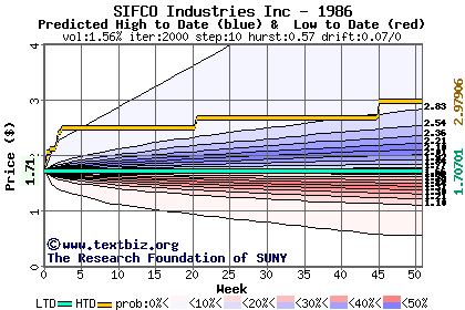 The high to date and low to date prices of the stock plotted against a random walk model for 1986 (what's this?).