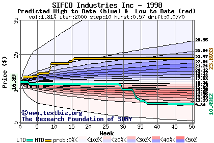 The high to date and low to date prices of the stock plotted against a random walk model for 1998 (what's this?).