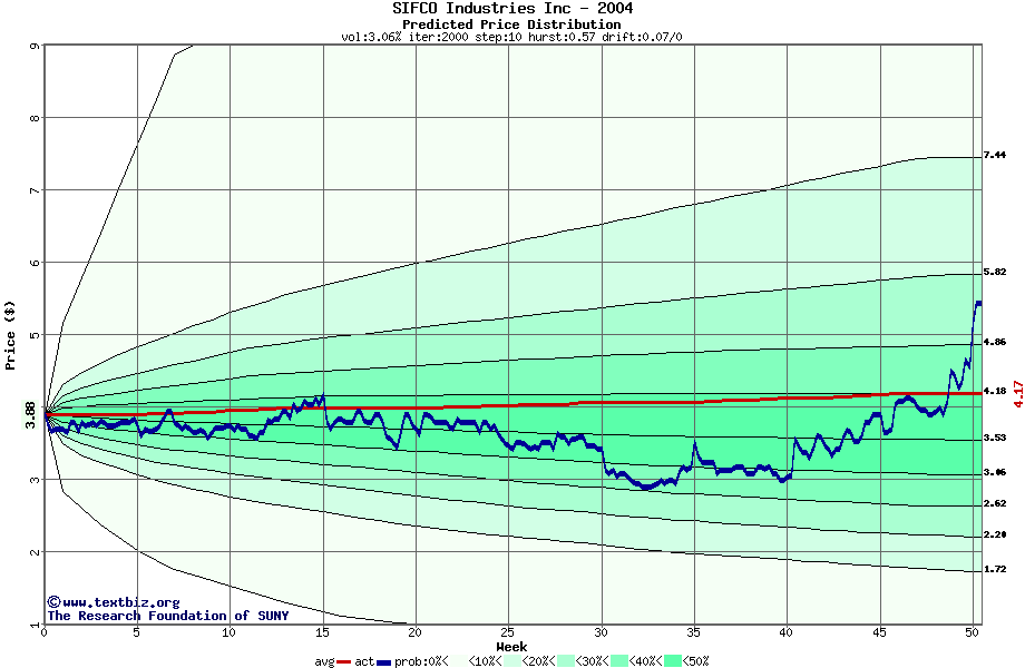 The following graph plots the year-to-date performance of the stock for 2004 compared to the probability calculated by a random walk model.