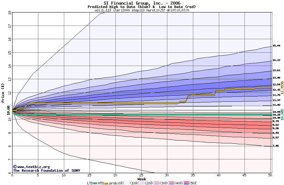 The high to date and low to date prices of the stock plotted against a random walk model for 2006 (what's this?).