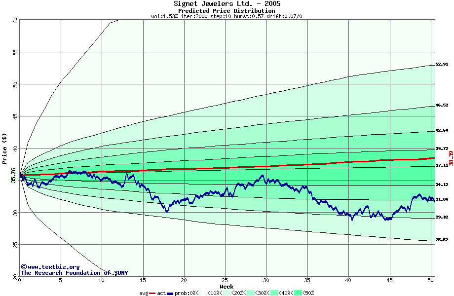 The following graph plots the year-to-date performance of the stock for 2005 compared to the probability calculated by a random walk model.