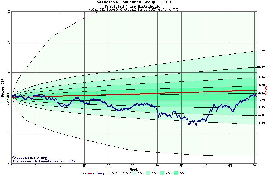 The following graph plots the year-to-date performance of the stock for 2011 compared to the probability calculated by a random walk model.