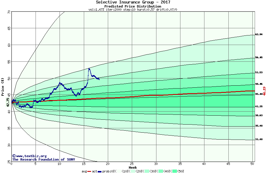 The following graph plots the year-to-date performance of the stock for 2017 compared to the probability calculated by a random walk model.