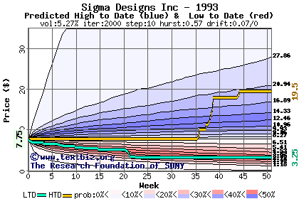 The following graph plots the year-to-date performance of the stock for 1993 compared to the probability calculated by a random walk model.