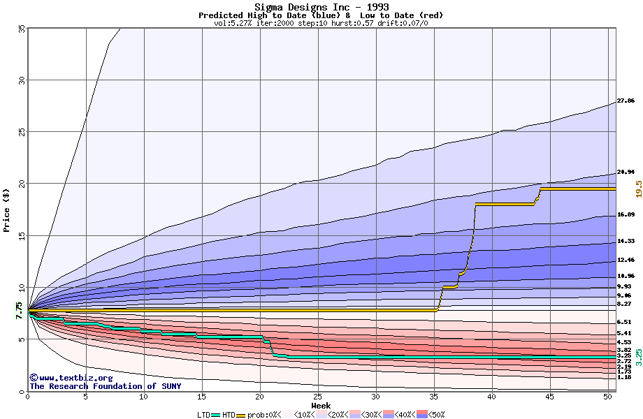 The high to date and low to date prices of the stock plotted against a random walk model for 1993 (what's this?).