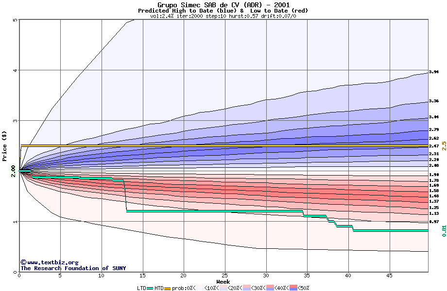 The high to date and low to date prices of the stock plotted against a random walk model for 2001 (what's this?).