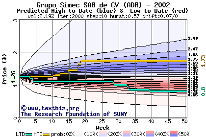 The high to date and low to date prices of the stock plotted against a random walk model for 2002 (what's this?).