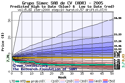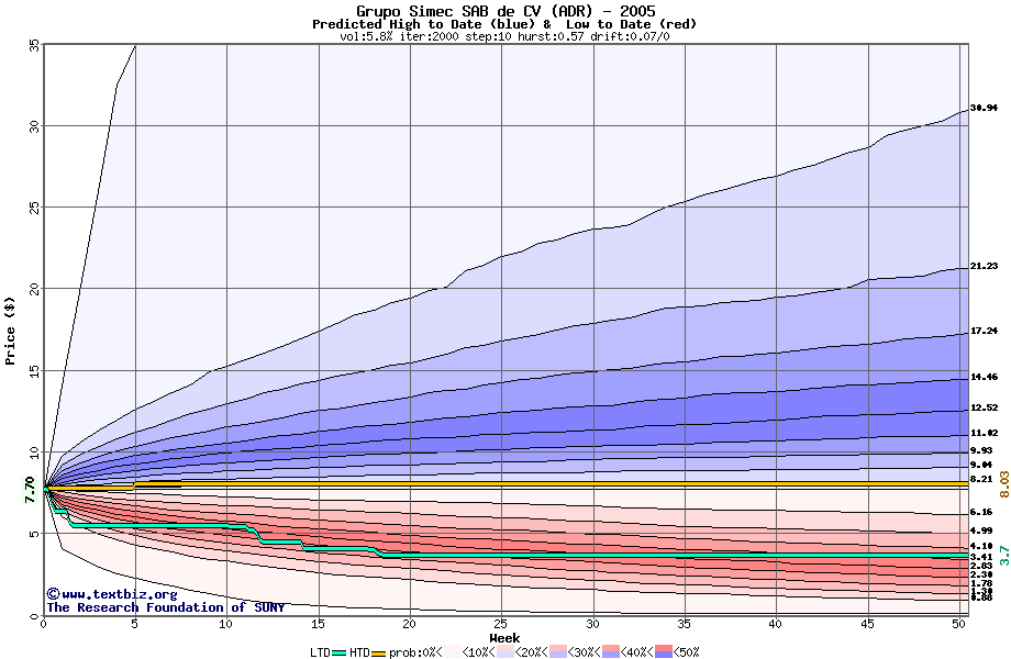 The high to date and low to date prices of the stock plotted against a random walk model for 2005 (what's this?).