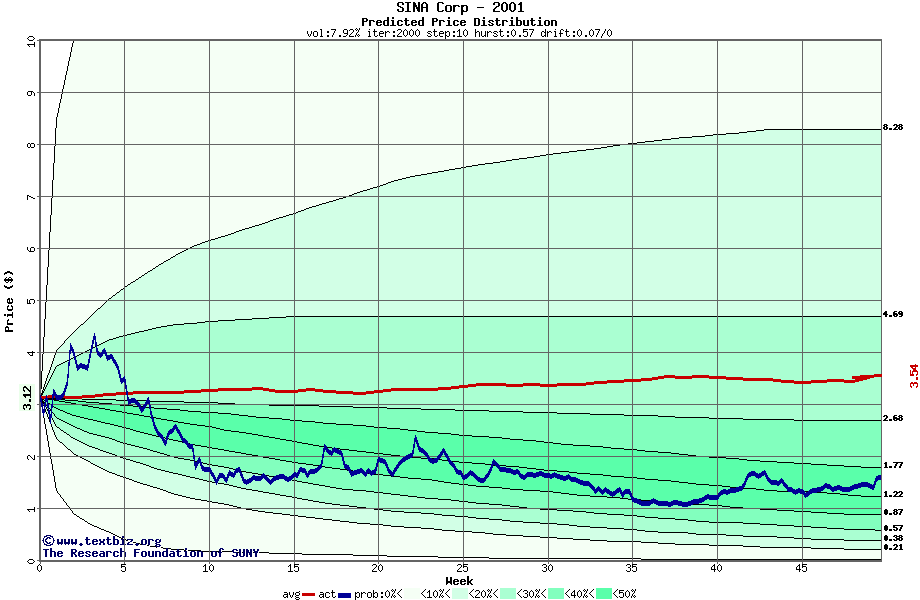 The following graph plots the year-to-date performance of the stock for 2001 compared to the probability calculated by a random walk model.