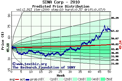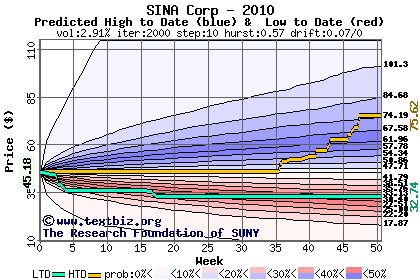 The high to date and low to date prices of the stock plotted against a random walk model for 2010 (what's this?).