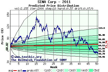 The high to date and low to date prices of the stock plotted against a random walk model for 2011 (what's this?).
