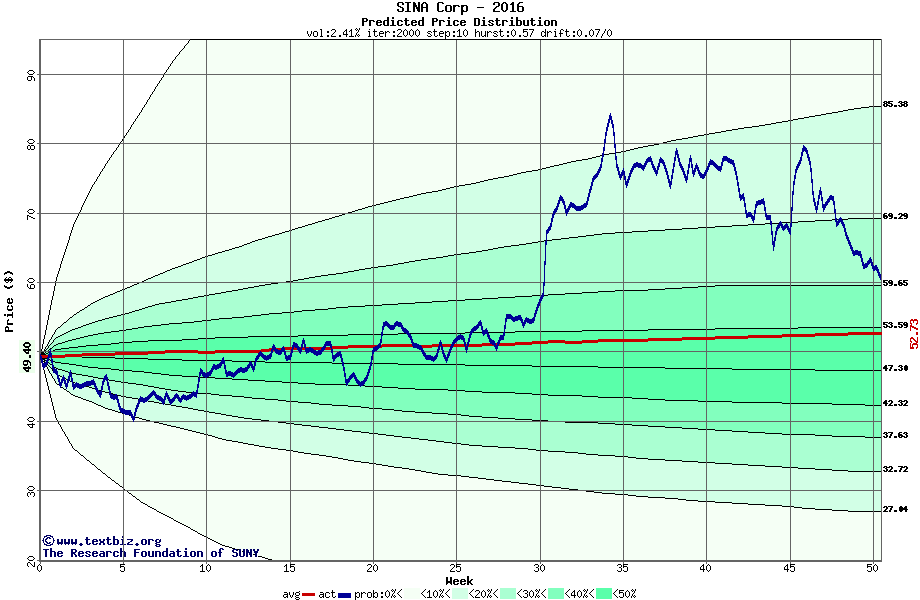 The following graph plots the year-to-date performance of the stock for 2016 compared to the probability calculated by a random walk model.