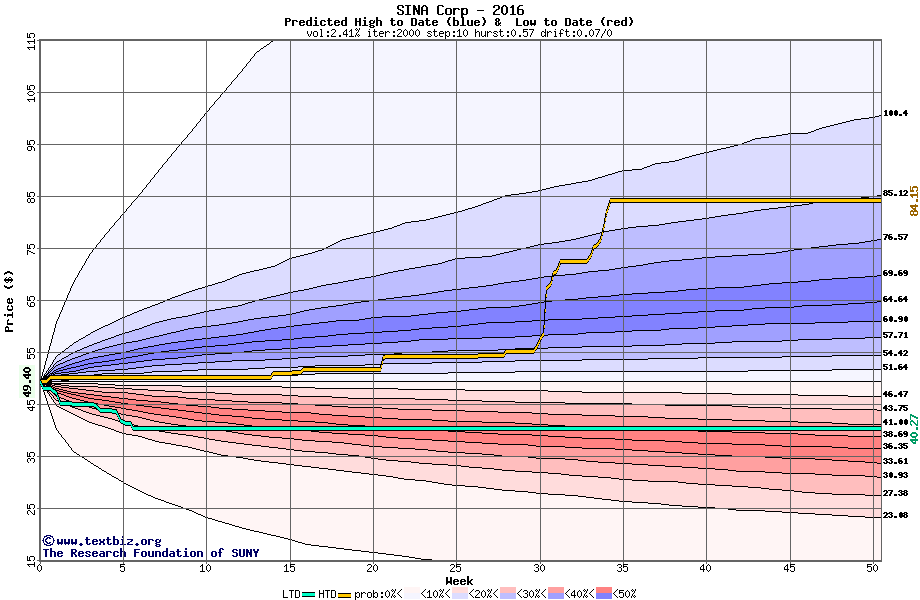 The high to date and low to date prices of the stock plotted against a random walk model for 2016 (what's this?).