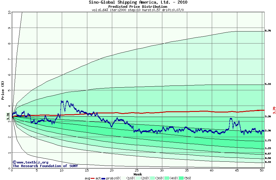 The high to date and low to date prices of the stock plotted against a random walk model for 2010 (what's this?).