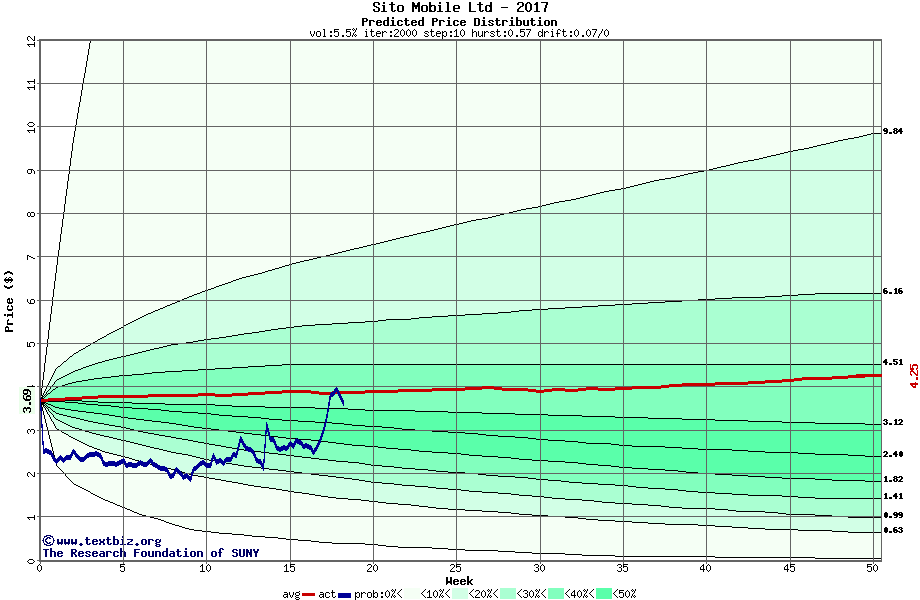 The high to date and low to date prices of the stock plotted against a random walk model for 2017 (what's this?).