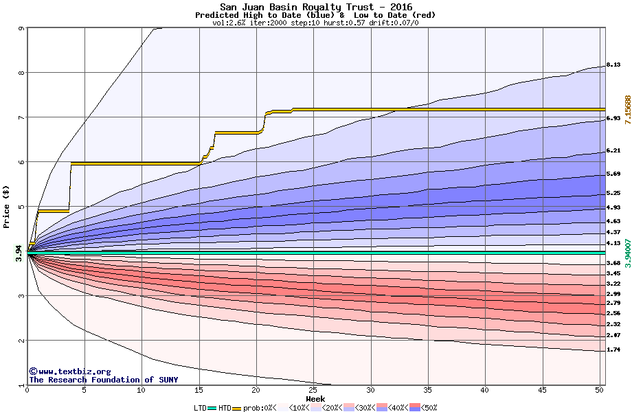 The high to date and low to date prices of the stock plotted against a random walk model for 2016 (what's this?).