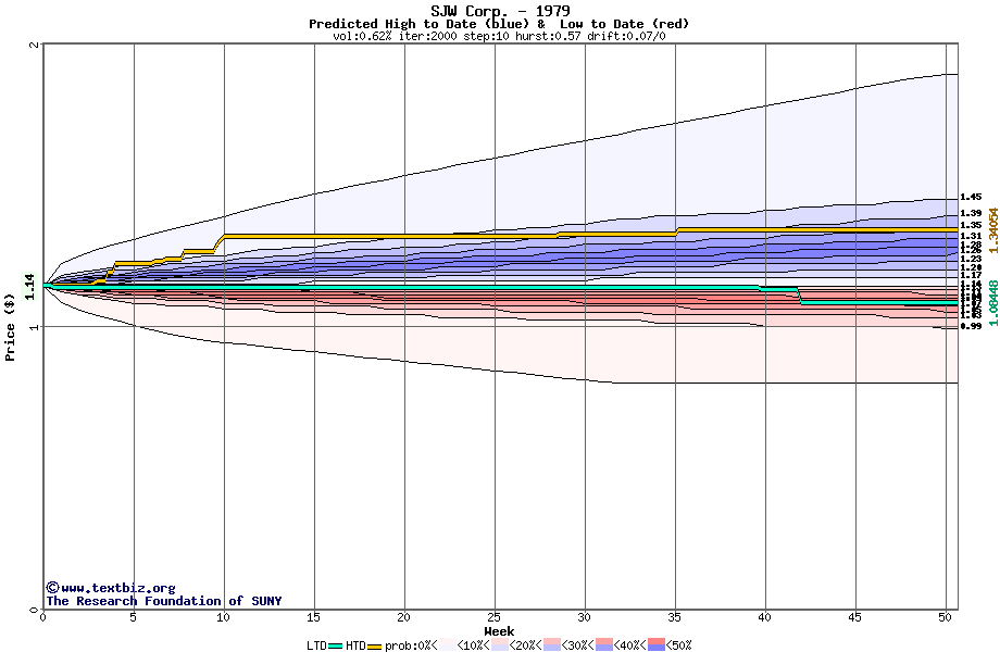 The high to date and low to date prices of the stock plotted against a random walk model for 1979 (what's this?).