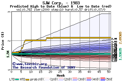 The high to date and low to date prices of the stock plotted against a random walk model for 1983 (what's this?).