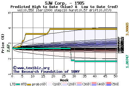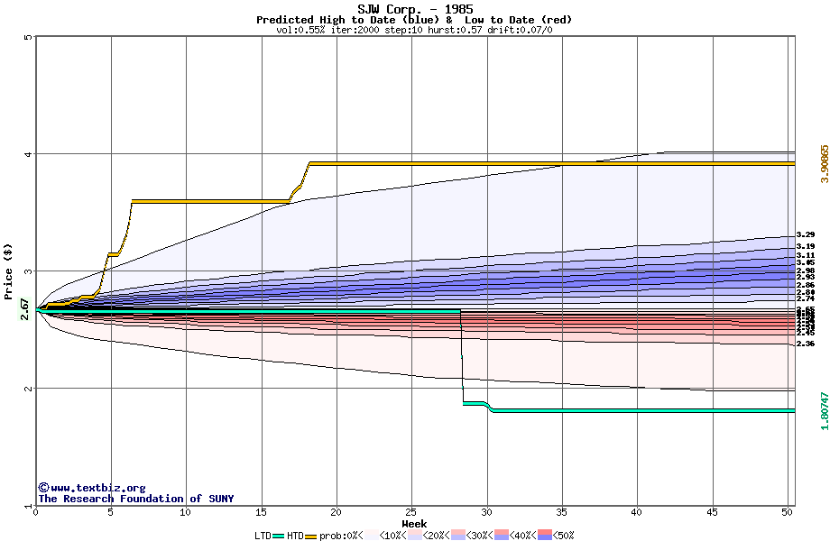 The high to date and low to date prices of the stock plotted against a random walk model for 1985 (what's this?).