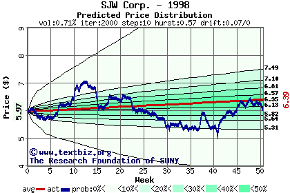 The high to date and low to date prices of the stock plotted against a random walk model for 1998 (what's this?).