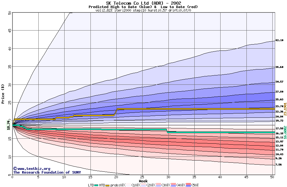 The high to date and low to date prices of the stock plotted against a random walk model for 2002 (what's this?).