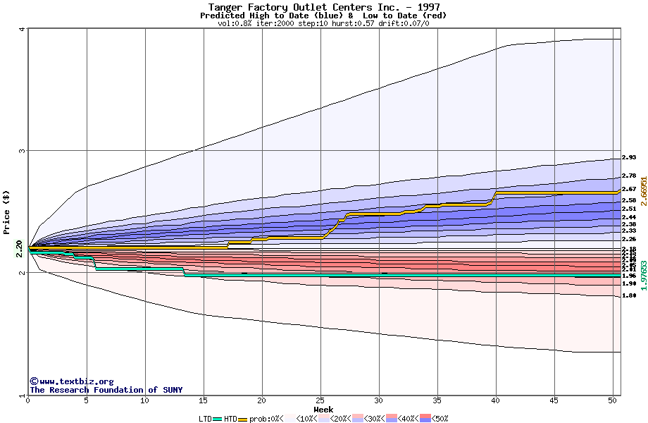 The high to date and low to date prices of the stock plotted against a random walk model for 1997 (what's this?).