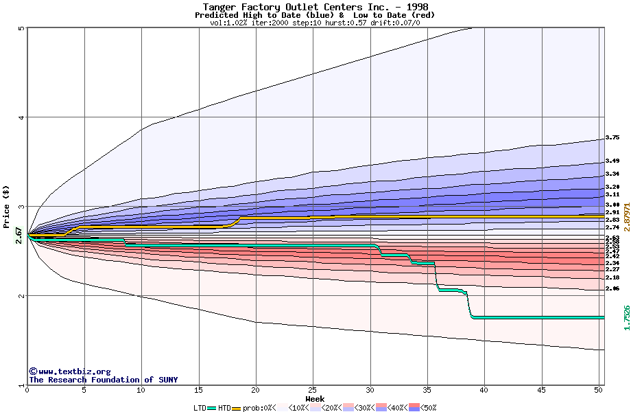 The high to date and low to date prices of the stock plotted against a random walk model for 1998 (what's this?).