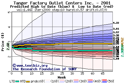 The high to date and low to date prices of the stock plotted against a random walk model for 2001 (what's this?).