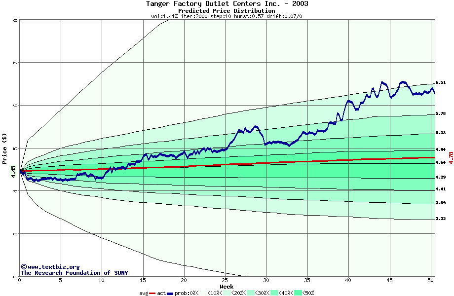 The following graph plots the year-to-date performance of the stock for 2003 compared to the probability calculated by a random walk model.
