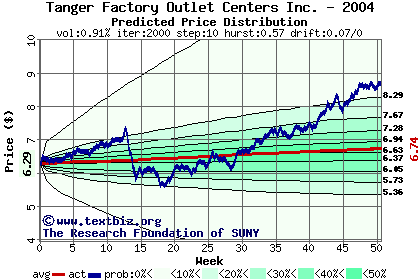 The following graph plots the year-to-date performance of the stock for 2004 compared to the probability calculated by a random walk model.