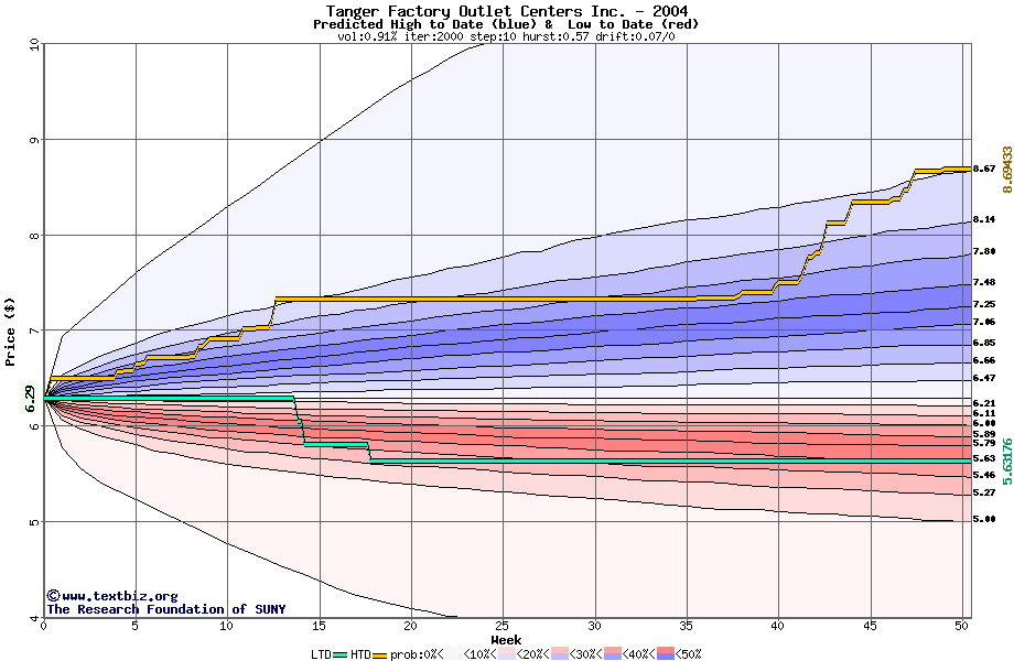 The high to date and low to date prices of the stock plotted against a random walk model for 2004 (what's this?).