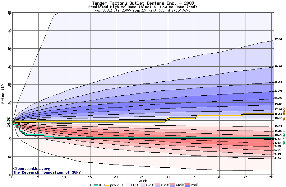 The high to date and low to date prices of the stock plotted against a random walk model for 2009 (what's this?).