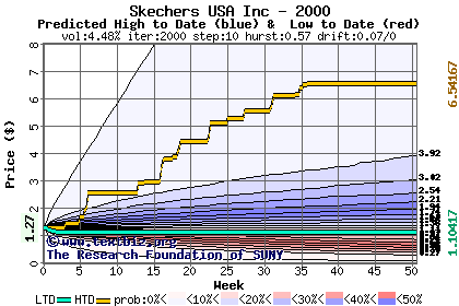 The high to date and low to date prices of the stock plotted against a random walk model for 2000 (what's this?).