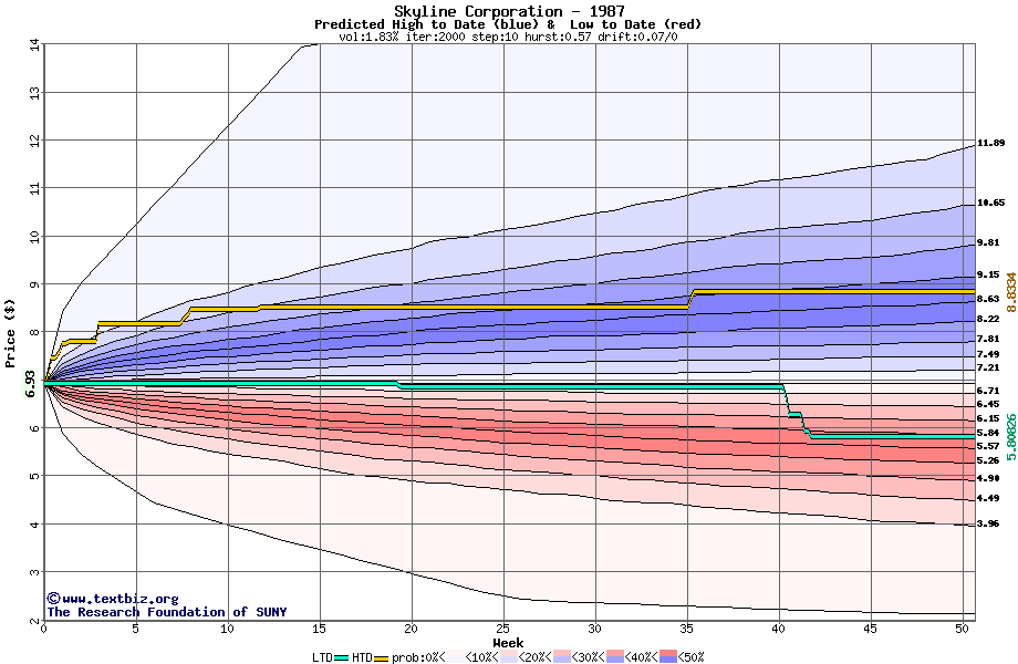 The high to date and low to date prices of the stock plotted against a random walk model for 1987 (what's this?).